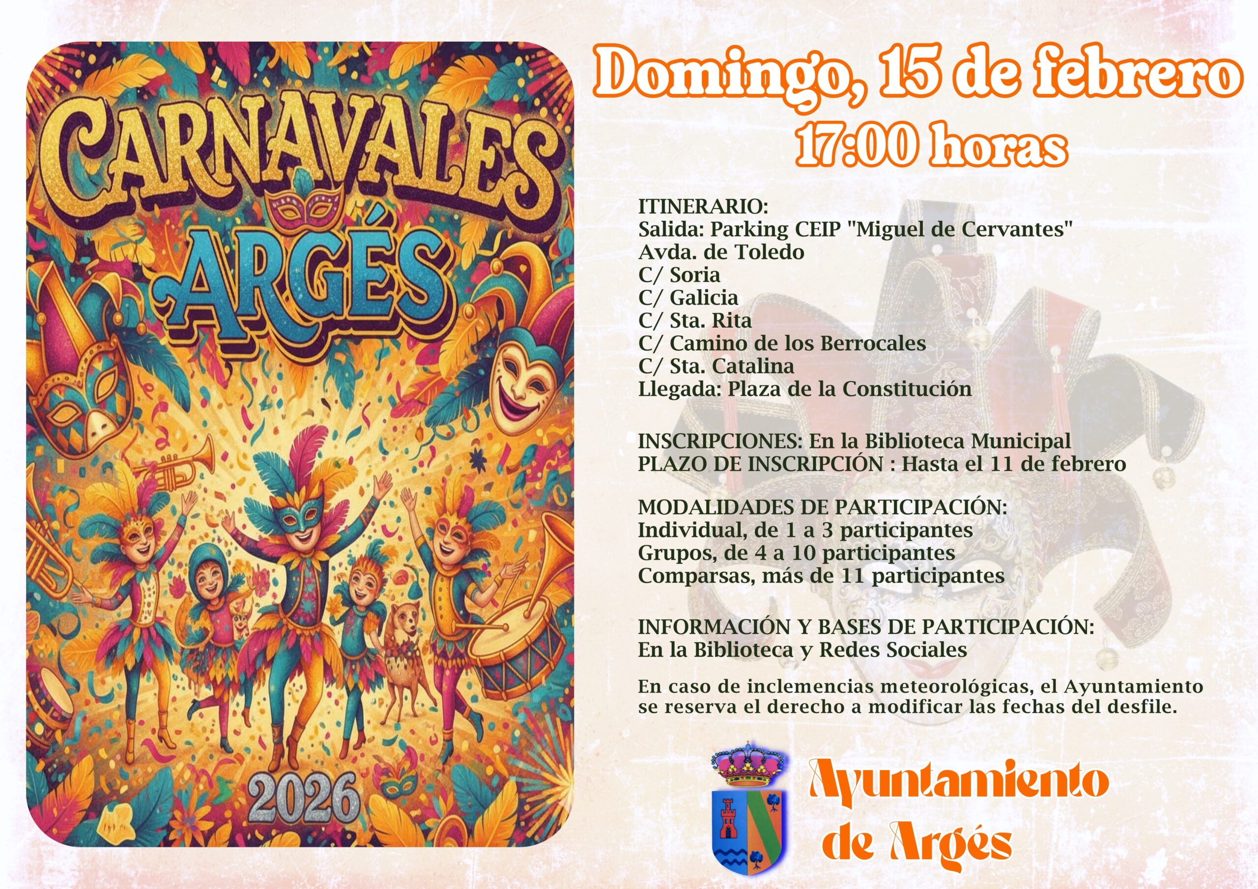 El Carnaval es una fiesta que tiene lugar inmediatamente antes de la Cuaresma y cuya fecha es variable. En Argés se celebra con un desfile en el que participan comparsas y grupos tanto locales como de otros municipios.